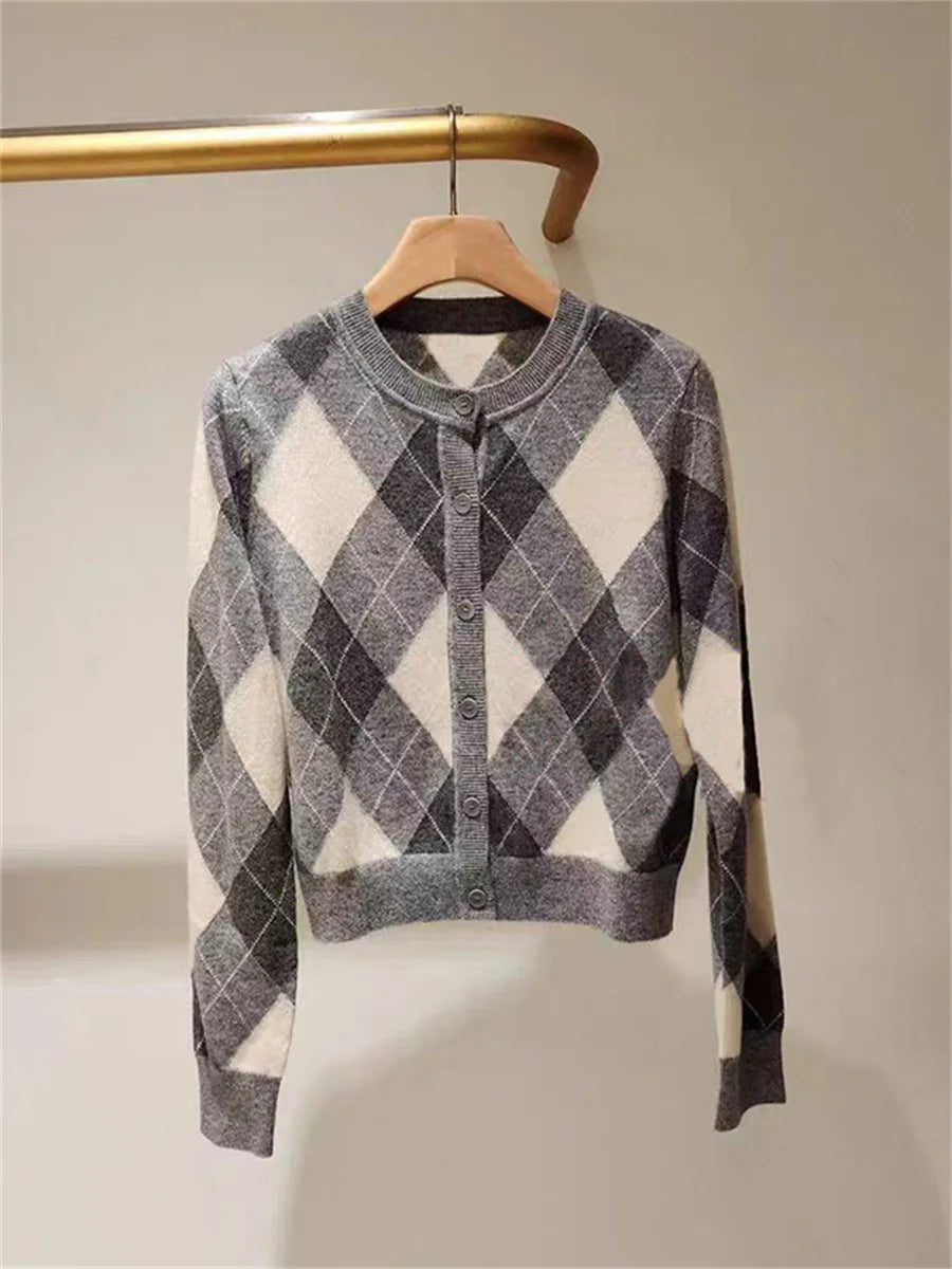 2025 Autumn Women Contrast Color Argyle Sweater Coat O-Neck Single Breasted Long Sleeve Lady Knit Cardigan Top