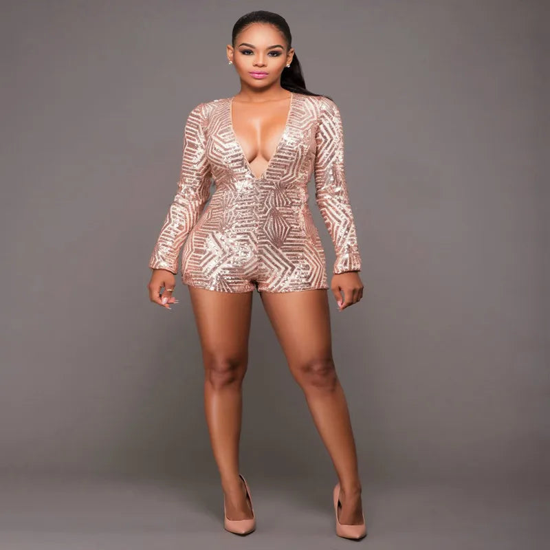 Two-Piece Short Pants Suit with Deep V-Neck Backless Long Sleeve Zipper Sexy One-Piece Pants Polyester Geometric Bright Sequins